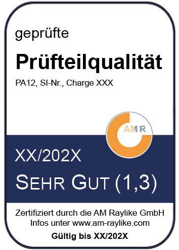 Die AM Raylike GmbH hat mit dem AMR-Siegel ein Bewertungssystem entwickelt, das speziell auf die Anforderungen der additiven Fertigung zugeschnitten ist. Ziel des Siegels ist es, die Maßgenauigkeit von Bauteilen objektiv zu prüfen und zu dokumentieren,